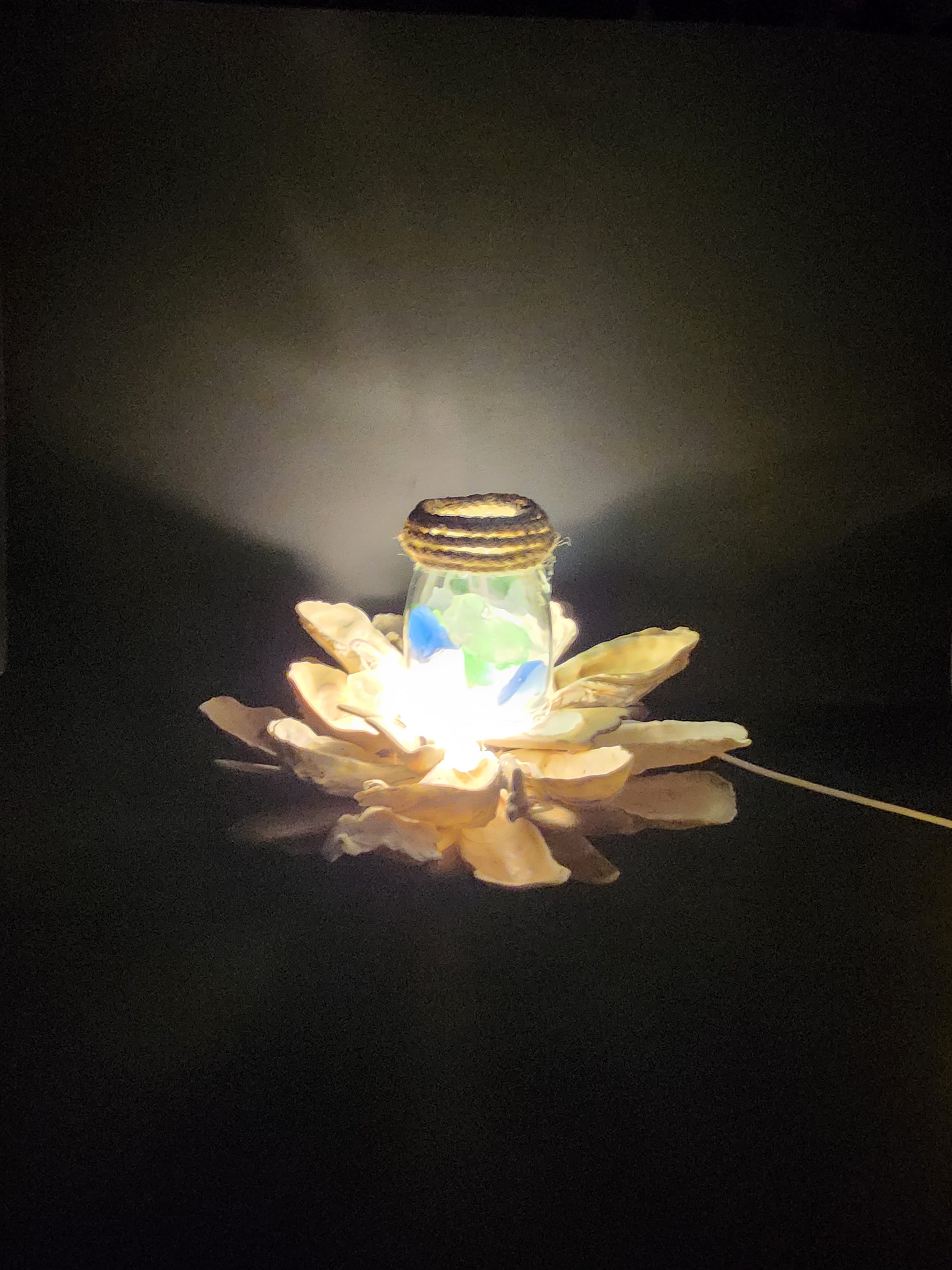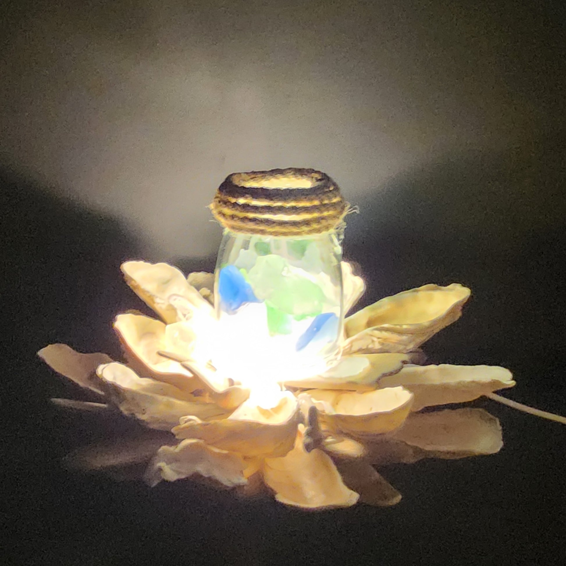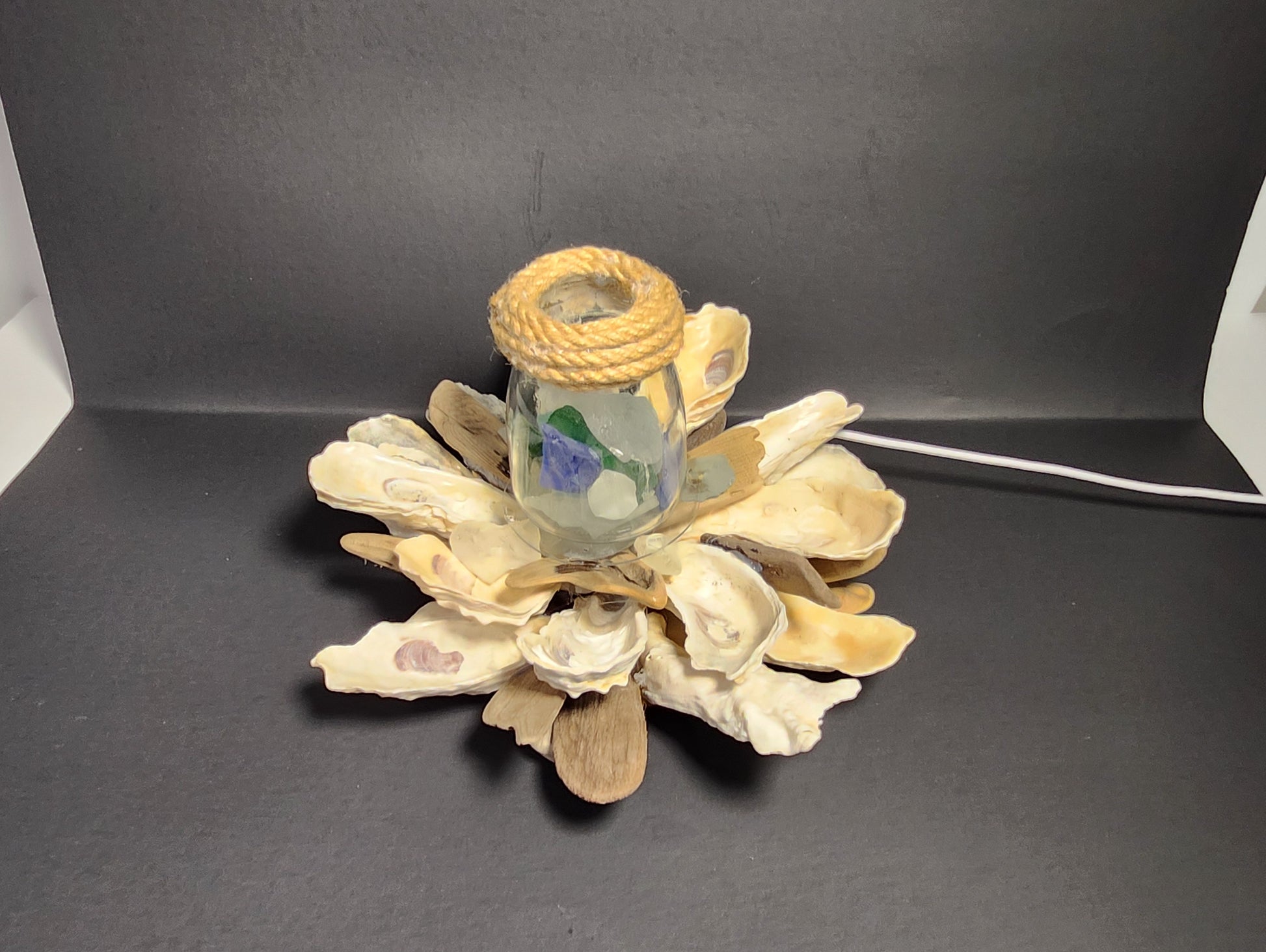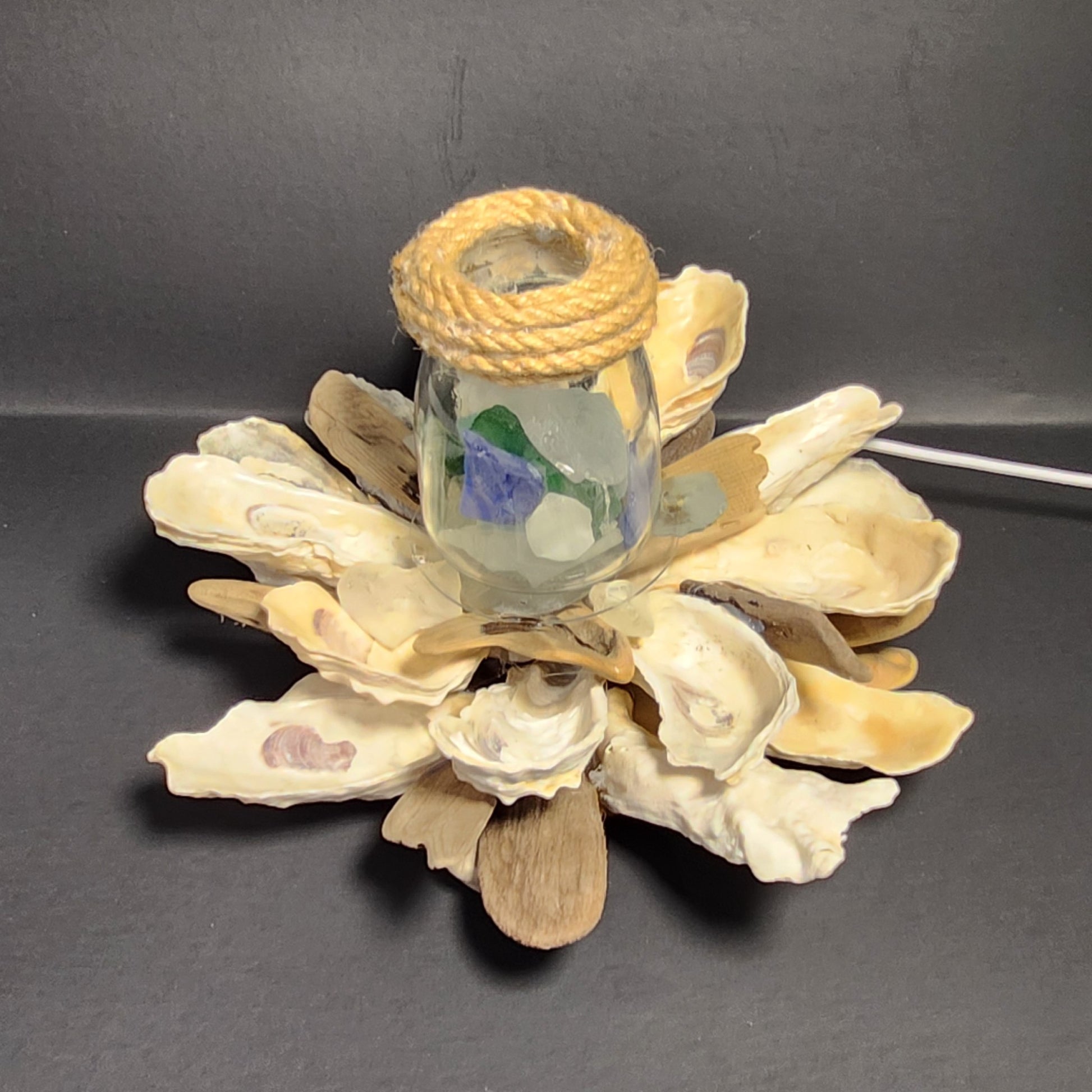 Illuminate your home with the soft, warm glow of our Glow Art Night Light - Option 19. Handcrafted with oyster shells, driftwood, and sea glass, this unique night light adds a touch of coastal charm while providing a peaceful ambience to any room. Enjoy the beauty and benefits of natural materials in one beautiful piece.