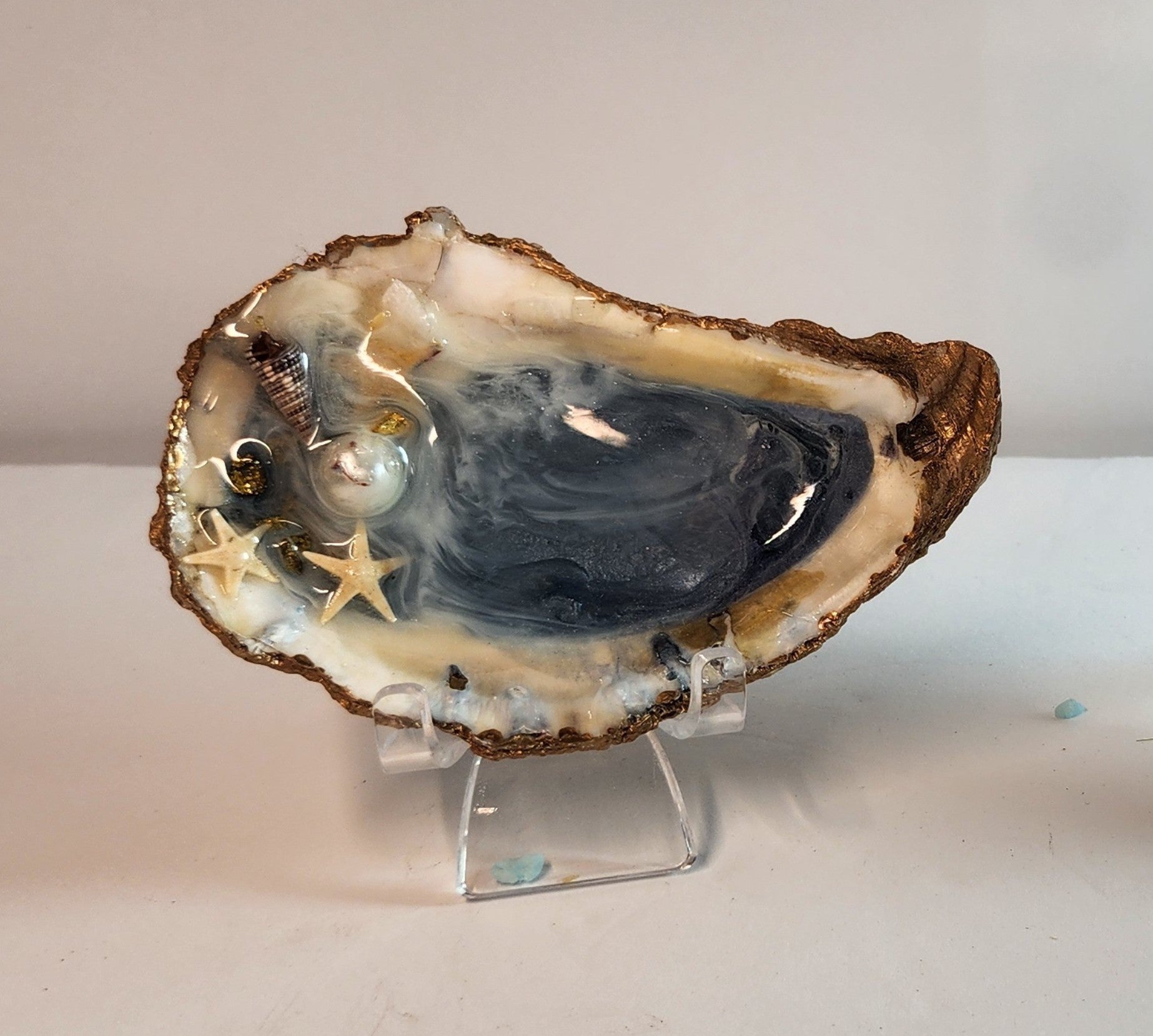 The Ocean's Treasure is a beautiful and functional oyster shell designed as a jewelry dish. Its ocean blue color and intricate starfish, pearl, and tiny shell details make it a stunning addition to any room. Keep your jewelry organized and easily accessible while adding a touch of the sea to your decor.