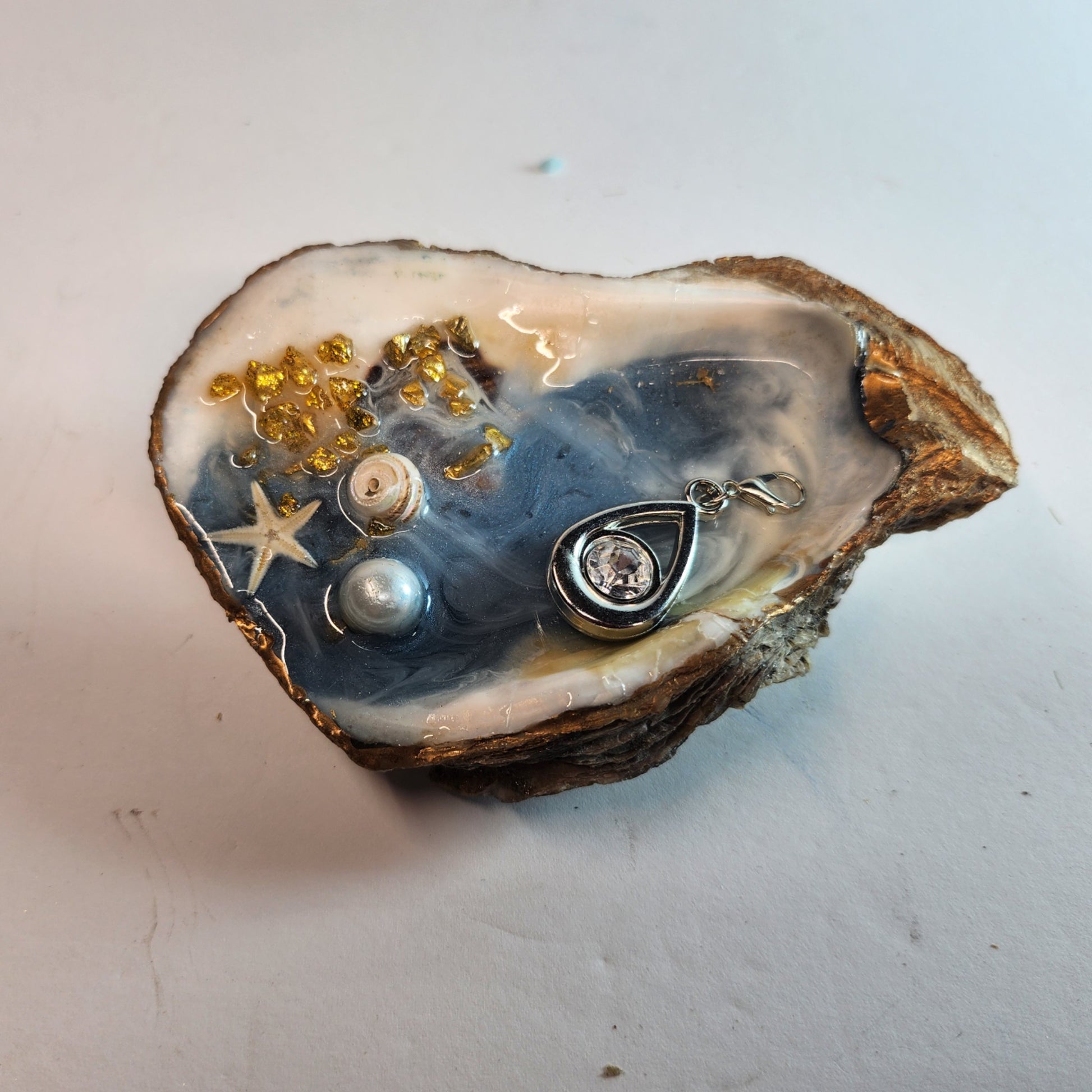 The Ocean's Treasure is a beautiful and functional oyster shell designed as a jewelry dish. Its ocean blue color and intricate starfish, pearl, and tiny shell details make it a stunning addition to any room. Keep your jewelry organized and easily accessible while adding a touch of the sea to your decor.